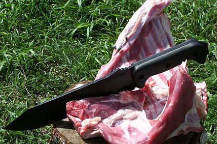 Тут на первое место сразу вышел Компаньон, перемахнул грудину барана в одно движение и легко справился с шеей. Рубка трубчатых костей и обрезка мяса также не вызвали никаких затруднений. Как не крути, а с мясом удобнее работать не слишком длинным ножом. Рубануть позвоничник вдоль Компаньоном не удалось — потребовалось дополнительное ударное воздействие на нож. ТакТул тоже хорошо справлялся с костями и мясом, только его непривычная квадратная форма иногда мешала. Конечно же, мы попробовали в бараньем деле и Боуи — для перерубания позвоночника оказалось достаточно одного удара.