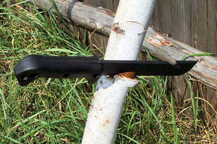 Лучшие летные качества показал Боуи. Его баланс, обоюдоострая заточка острия, солидный вес сыграли свою положительную роль. Компаньон тоже втыкался неплохо, а вот ТакТул хорошо летал, но плохо входил в дерево — стамесочная заточка не позволяла. Мачете для метания и вовсе не годится, в ствол его удалось воткнуть только рукой. Хотя, после долгих тренировок, наверняка можно научиться метать и его. Не этом тесте Боуи получил небольшое увечье, он прилетел в рукоять воткнутого в дерево Компаньона. Результат получился весьма показательный: у Боуи на фальшлезвии образовался скол глубиной 0.2 мм и длиной 4 мм, а на металле рукояти Компаньона осталась зарубка глубиной около миллиметра! Это позволило нам сделать вывод, что BK&T применяет на своих клинках зонную закалку: до максимальной твердости термообработана только режущая часть, а остальная масса стали остается вязкой и стойкой к ударным нагрузкам. Эта методика пришла из технологии длинномерного холодного оружия — сабель, шашек и т. д.