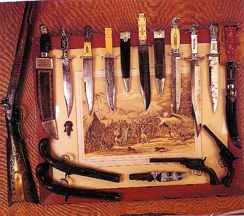 Авантюрист, политик и бизнесмен полковник Джеймс Боуи пал в бою вместе с другими героями американского фронтира, Дэвидом Крокеттом и Вильямом Барретом Тревисом, в марте 1836 года, защищая техаский форт Аламо от регулярной мексиканской армии президента Санта Анны. Именно в этот мартовский день ,имена этих «полу-коней полу-крокодилов», как они гордо называли себя, гравируя этих мифических животных на своих ножах, окончательно стали легендой и начали свою собственную жизнь, абсолютно не связанную с их реальными владельцами. Молодое американское государство катастрофически нуждалось в культовых героях, и мифотворчество началось !